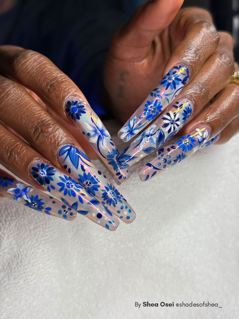 Nail artist Shea Osei (@shadesofshea_) recently created a stunning bespoke manicure for Cynthia Erivo at the New York City premiere of Wicked: For Good. The theme: Arctic Bloom — a delicate, winter-inspired design featuring intricate floral patterns with a variety of blue tones.